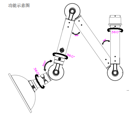 *活動功能:配備三組折疊關(guān)節(jié),折疊角度75-300°,一個(gè)水平360°旋轉(zhuǎn)、二個(gè)末端軸向360°旋轉(zhuǎn)功能;(zl****)